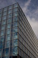 Een scherp glazig gebouw in Amsterdam met een blauwe lucht en een paar wolken.