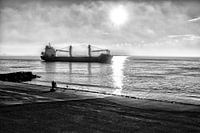 Een schip gaat buitengaats via de monding van de Westerschelde bij Vlissingen.