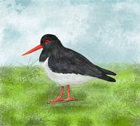 Een digitale tekening in het programma Pro create van een scholekster. De vogel is afgebeeld op een groen grasveld met een wolkige blauwe lucht. De vogel staat in het gras en je ziet hem van opzij. Hij kijkt naar links.