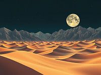 Dompel jezelf onder in de adembenemende rust van "Lunar Desert Dreamscape," een prachtig stuk dat de etherische schoonheid van een uitgestrekte woestijn bij nacht vastlegt. Onder de waakzame blik van een lichtgevende volle maan strekken gouden zandduinen zich uit tot aan de horizon, hun zachte contouren benadrukt door de zachte gloed van de maan's. In de verte rijzen majestueuze bergen op. In de verte rijzen majestueuze bergen op, hun silhouetten voegen een dramatische achtergrond toe aan het serene landschap. De donkere, met sterren bezaaide hemel maakt dit betoverende tafereel compleet en nodigt kijkers uit in een wereld van vrede, uitgestrektheid en verwondering. Dit kunstwerk is perfect voor wie houdt van de grootsheid van de natuur, de mystiek van de woestijn en de tijdloze allure van de nachtelijke hemel.
