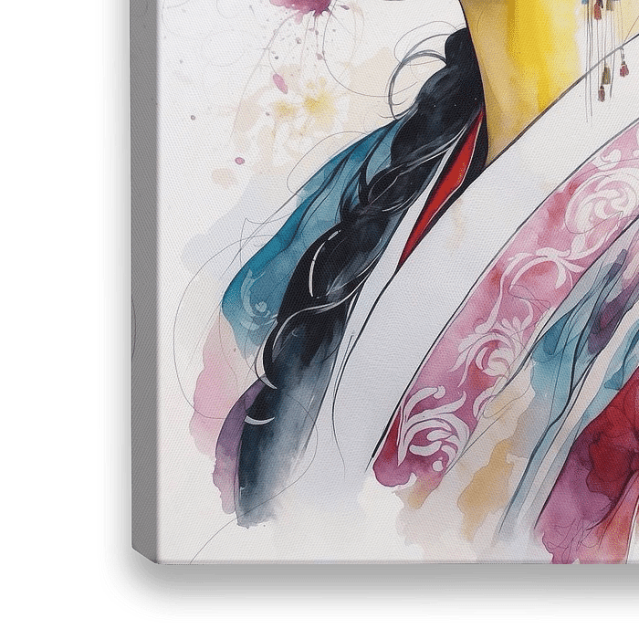 Een delicaat portret in aquarelstijl van een sierlijke Oost-Aziatische vrouw in traditionele keizerlijke kledij. De achtergrond is dromerig en abstract, geschilderd in zachte, gedempte aardetinten met subtiele spatten rood en beige, die doen denken aan herfstbladeren en vloeiende inkt. Het hele werk heeft een verfijnde, etherische sfeer – een fusie van aquarel en digitale schilderkunst, veel detail, zachte focus, geïnspireerd door traditionele Chinese portretkunst en hedendaagse beeldende kunst.