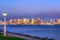 Een gouden skyline gezien vanaf Harbor Island in San Diego, Californië, VS.