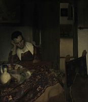 Het wangedrag van onbewaakte dienstmeisjes was een veel voorkomend onderwerp voor zeventiende-eeuwse Nederlandse schilders. Maar in zijn afbeelding van een jong dienstmeisje dat naast een glas wijn ligt te slapen, verandert Vermeer een doodgewone scène in een onderzoek naar licht, kleur en textuur dat elke moraliserende les overstijgt. Hoewel het omgevallen glas op de voorgrond (nu geschuurd) en het verfomfaaide tafelkleed op een pas vertrokken bezoeker kunnen wijzen, koos Vermeer ervoor om de mannelijke figuur die hij oorspronkelijk in de deuropening had laten staan, te verwijderen, waardoor het schilderij nog dubbelzinniger werd.