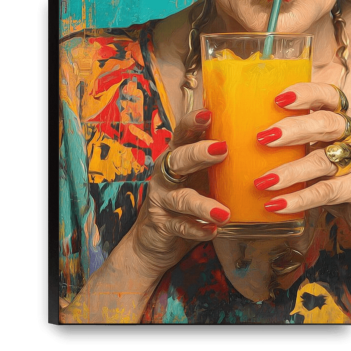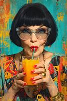 De foto toont een stijlvolle oudere dame met een zwart bobkapsel en een grote, doorzichtige retrobril. Haar lippen zijn felrood geverfd en ze drinkt flirterig door een rietje uit een glas gevuld met een sinaasappeldrankje. Ze draagt kleurrijke kleding en gouden sieraden - ringen, armbanden, oorbellen. De achtergrond is levendig…
