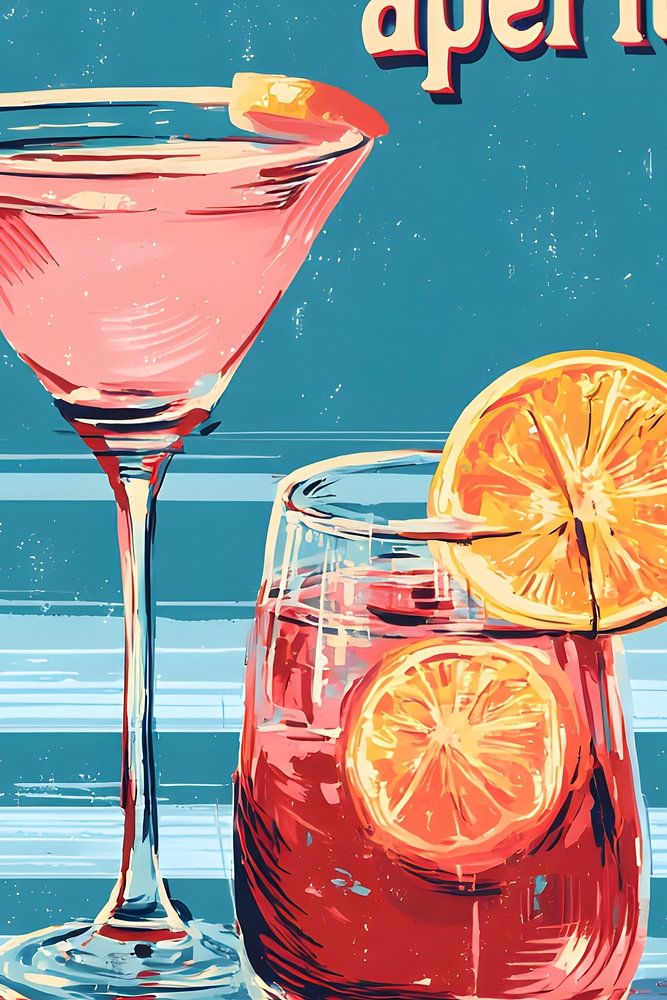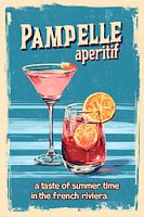 De afbeelding toont een kleurrijke retroposter in vintage-stijl die reclame maakt voor een aperitief met de naam Pampelle. Twee drankjes staan op een blauwe, enigszins verweerd ogende achtergrond: een roze cocktail in een elegant martiniglas en een rood, sprankelend aperitief in een tumbler met twee schijfjes oranje citrusvruchten. De…