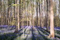Met de zon in de rug ontvouwt zich een tapijt van boshyacinten dat het bos in een zee van paars kleurt. De lange schaduwen van de statige beukenstammen trekken lijnen over de bloemen en leiden het oog dieper het bos in. Het samenspel van licht, kleur en herhaling creëert een uitnodigende en bijna magische diepte in het landschap.