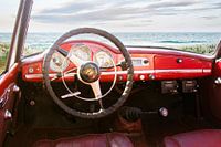 De fotomontage toont het interieur van een klassieke Alfa Romeo Giulietta Spider, een iconische sportauto met een…