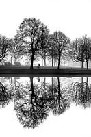 De Leeuwarder stadsgracht op een vroege morgen in de mist met een fietser op het pad en door het tegenlicht van de opkomende zon strak gespiegeld in het stilstaande water. In zwart/wit.