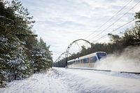 Een Sprinter Light Train (SLT) van de Nederlandse Spoorwegen (NS) is onderweg als sprinter van Hilversum naar Utrecht en rijdt hier onder de 'Gotische bogen' door in een besneeuwd landschap. Door de hoge snelheid van de trein ontstaat er stuifsneeuw achter de trein.