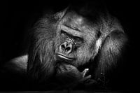 Een staal sterke mannelijke gorilla stortte op vakantie in met een peinzende geinteresseerde blik, krachtige handen, zwarte achtergrond