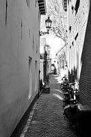 Deze zwart-wit foto van een steeg heb ik gemaakt in de oude centrum van Harderwijk. Deze steeg wat je ziet is de Vleeshouwersteeg, aan het einde zie je de Grolsteeg. Zoals je kunt zien word deze steeg ook als fietsenstalling gebruikt door mensen uit Harderwijk die willen winkelen, het is wel eens waar een rustige steeg waar weinig mensen door komen. Toen ik deze foto maakte was het mooi zonnig weer aan het einde van de winter, je ziet het aan de hoge begroeiing dat in de achtertuinen staat. Deze foto heb ik uit de hand genomen om aangezien er meer dan genoeg licht was. Ik heb wel achteraf ervoor gekozen om het om te zetten naar zwart-wit, verder heb ik de contrast wel aangepast zodat het duidelijker op de foto komt.
