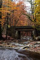 Deze foto met een stenen brug heb ik gemaakt in de Belgische Ardennen bij het plaatsje Eupen, het is in de buurt van de Duitse grens. Ik weet alleen niet hoe deze rivier heet ook al is het me wel vertelt. Zoals je op de foto kunt zien was het al herfst toen ik deze foto maakte, de bomen stonden al goed in de herfstkleuren. Ik heb een langere sluitertijd gebruikt zodat er de stroming in de foto te zien is, hiervoor heb ik een 3 stops grijsfilter gebruikt. Natuurlijk heb ik ook een statief gebruikt waar mijn camera op stond, ik heb verder een afstandsbediening gebruikt. Om op deze plek te kunnen komen moest ik wel een stukje naar beneden lopen. De weg over de brug komt van Eupen, waar het naar toe gaat weet ik niet. Het bos waar ik was bestaat voornamelijk loofbomen zoals je kunt zien.
