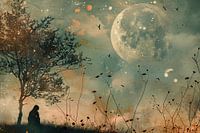 Ontsnap aan de realiteit met dit betoverende ontwerp waarin een lichtgevende maan majestueus boven een sereen landschap hangt. Onder de wakende ogen van deze stille getuige, zit een eenzame figuur in diepe overpeinzing, omgeven door de wazige contouren van de natuur. Het kleurenpalet is een dans van sepia- en aardetinten, doorspekt met vleugjes oranje die het canvas op subtiele wijze tot leven wekken. Deze creatie nodigt de kijker uit om de stilte en de vredigheid die het uitstraalt in zich op te nemen. Het is meer dan kunst; het is een poort naar een wereld waar tijd en zorgen vervagen in de schaduwen van het avondlicht.