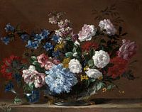 Een stilleven van hyacinten, rozen, convolvulus en andere bloemen in een verguld zilveren vaas op een stenen richel, Jean-Baptiste Monnoyer