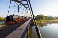 Een stoomtrein van de Veluwsche Stoomtrein Maatschappij (VSM) rijdt over de spoorbrug bij Zutphen en is onderweg naar de Raildagen op het terrein bij Strukton en Arriva nabij het station van Zutphen.