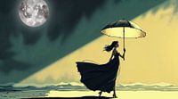 Het beeld toont een vrouw met een elegante parasol die zich over een strand beweegt. De ene helft van de compositie is verlicht door de stralende zon, terwijl de andere helft in mysterieus maanlicht gehuld is. Dit krachtige contrast symboliseert yin en yang—de balans van tegenstellingen die elkaar niet alleen aanvullen, maar noodzakelijk zijn voor elkaar. De vloeiende overgang tussen licht en donker weerspiegelt een fundamenteel principe: in zowel fotografie, kunst als het leven zelf draait alles om het vinden van een artistieke en filosofische balans.