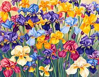 Een levendig en kleurrijk schilderij van een verscheidenheid aan irisbloemen. De irissen staan in volle bloei, met hun bloemblaadjes wijd uitgespreid in een mix van rijke paarse, zonnig gele, diepblauwe en hartstochtelijke rode tinten. Sommige bloemen staan bij elkaar, terwijl andere op zichzelf staan, elk met hun eigen unieke…