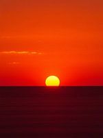 Dit verbluffende kunstwerk legt de intense schoonheid van een zonsondergang vast, waarbij de levendige geeloranje zonneschijf onder een perfect vlakke horizon zakt, waardoor de hele hemel en het reflecterende oppervlak eronder in schitterende tinten van vurig oranje en diep karmozijnrood worden gehuld. De minimale compositie benadrukt…
