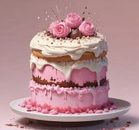 een vier lagen roze verjaardag bruids taart geglaceerd met witte crème wip cream slagroom chocolade ertussen en een topping marsepein roze roosjes decoratie erboven op met een roze pastel achtergrond.