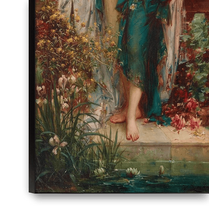 De slanke vrouw is blond en staat braless in een doorzichtige sheer dress aan een vijver in een mooie tuin of park waar de bloemen in volle bloei staan. Om haar nek hangt een engeltje welke het lieflijke schilderij afmaakt.