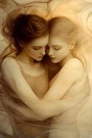 De foto toont twee vrouwen in een intieme omhelzing, omringd door een droomachtige en fantastische achtergrond. Hun lichamen lijken bijna gewichtloos, alsof ze zweven in een etherische ruimte tussen droom en werkelijkheid. De zachte lijnen van hun silhouetten worden omringd door delicate, glinsterende kleuren die doen denken aan het…