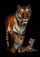 Een tijger met haar twee welpen, een prachtig werk van licht en schaduwen. Dit werk is van zeer hoge kwaliteit en nergens anders verkrijgbaar.
