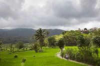 De intens groene heuvel van een traditioneel rijstterras in de prachtige Sidemen-vallei van Oost-Bali, Indonesië, is een van de meest rustige plekken op aarde.