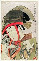 Yoshiwara Suzume door Utamaro Kitagawa (1753-1806), een prent van een traditionele Japanse vrouw die een waaier vasthoudt en een traditionele doorzichtige hoed draagt. Origineel uit de Library of Congress.