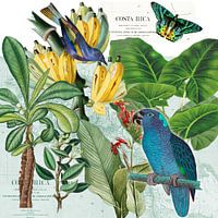 Twee vogels, een vlinder, veel verschillende groene planten en een kaart zijn de tropische droom die iedereen in huis kan halen.
