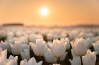 Een dromerig wit tulpenveld met ondergaande zon in Nederland