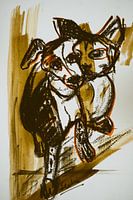 Een verbondenheid tussen 2 dieren. Het is mooi om te zien als er een band ontstaat tussen huisdieren. De hond en de kat die maatjes zijn geworden. Een grappig spontaan geschilderd werk waar de twee dieren in elkaar verweven lijken te zijn. Liesbeth heeft gebruik gemaakt van mooie naturel kleuren met contrasterend zwart wat het tot een sterk werk maakt met vlot lijnenspel.