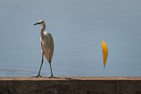 Een zilverreiger kijkt naar een geel vallend blad in de voorgrond. Foto genomen in een park met een grote vijver in Noord Jakarta, Indonesie.