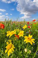 Een veld met wilde bloemen in een polder in noord Groningen op een mooie zomeravond. Typische Hollandse wolkenluchten trekken voorbij. Ver op de achtergrond ligt de dijk van de Waddenzee. Het is een warme zomeravond en de bijen zoemen in de lucht. Een kleurrijk natuurlandschap waar je vrolijk van wordt.
