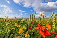 Een veld met wilde bloemen in een polder in noord Groningen op een mooie zomeravond. Mooie wolkenluchten schieten voorbij en de zon komt af en toe achter de wolken vandaan. Er waait een warme avondbries. De foto is genomen in een veld met wilde bloemen op een akker in de Oosterwolderpolder in het uiterste noorden van de provincie Groningen.