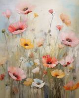 Een veld vol met bloemen. Klaprozen in pastelkleuren. Kleurrijk modern en abstract schilderij van een verzameling bloemen in alle kleuren. Met dit werk breng je vrolijkheid in huis!