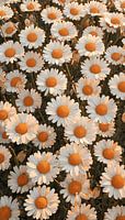 In een levendige close-up is een dicht tapijt van margrietachtige bloemen te zien, waarvan de smetteloos witte bloemblaadjes naar buiten stralen vanuit een zonnig oranje hart. Badend in het warme licht van wat laat in de middag lijkt te zijn in Ouargla, Algerije, creëren de bloemen een vrolijk en uitnodigend tafereel, een hint naar de…
