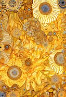 Een kleurrijk digitaal schilderij van een veld zonnebloemen in jugendstil stijl. Dit werk is geïnspireerd door de vormen en het kleurenpallet van "De Kus". Het werk geeft een warme en klassieke uitstraling aan uw interieur!