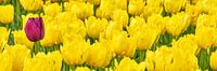 De lente in Nederland. Tussen een groot bloembollenveld met bloeiende gele tulpen bevind zich een een enkel paars gekleurde tulp.