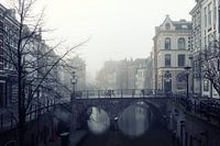 Een verlaten Maartensbrug over de Oudegracht in het centrum van Utrecht in de mist met zicht op de Lichte en Donkere Gaard. Deze foto van André Blom Fotografie maakt deel uit van zijn sfeervolle serie 'De Utrechtse Grachten'. De Maartensbrug vormt de verbinding tussen de Servetstraat en de Zadelstraat in de binnenstad.