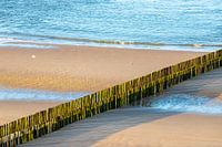 Een minimalistische foto van een verlaten strand bij Zoutelande met een rij golfbrekers. Ondanks contrast tussen het strand, de zee en de lucht geeft de foto een heerlijk rustig gevoel