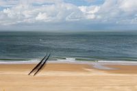 Een minimalistische foto van een verlaten strand bij Zoutelande met een rij golfbrekers. Ondanks contrast tussen het strand, de zee en de lucht geeft de foto een heerlijk rustig gevoel