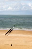 Een minimalistische foto van een verlaten strand bij Zoutelande met een rij golfbrekers. Ondanks contrast tussen het strand, de zee en de lucht geeft de foto een heerlijk rustig gevoel