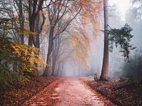 Een lang pad dat op een mistige herfstochtend diep het bos in leidt.