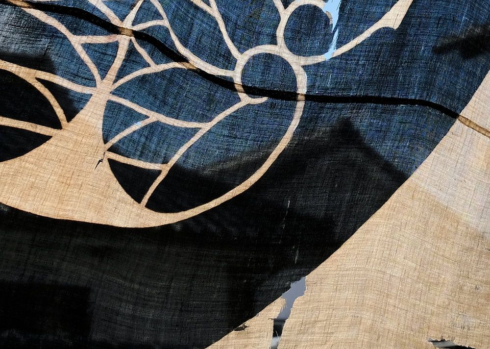 De zon schijnt door een verweerd doek in de wind in een Japanse tempel.