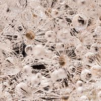 "Een vierkantje abstractie: Lijnen en cirkels" is een macrofoto van een pluisje van een paardenbloem, met een beige - bruine (lichte houtkleurige) achtergrond. Aan de pluisjes hangen waterdruppeltjes.