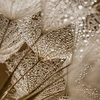 "Een vierkantje met de warme bruintinten van een Tragopogon" is een foto gemaakt van een prachtige pluizenbol van een Tragopogon (morgenster). Deze foto was een hele leuke uitdaging om te maken, omdat ik bijna vanuit de bol zelf wilde fotograferen. Dit geeft een mooi effect als een soort doorkijkje naar het achterliggende pluisje, waar de scherpte op ligt. Doordat je dicht op de "voorgrond pluisjes" zit, vervagen deze en kijk je als het ware langs de wazige pluizen naar een prachtig scherp pluisje. De druppels, van dit pluisje waar de scherpte ligt, geven een weerspiegeling van de achtergrond weer, wat zorgt voor een horizontale lijn die de druppels op deelt in twee vlakken, onder wit en boven bruinkleurig. Als je inzoomt op het werk, kun je dit zien! De warme natuurlijke kleuren van de Tragopogon creëren een landelijke sfeer en voelt natuurlijk aan.