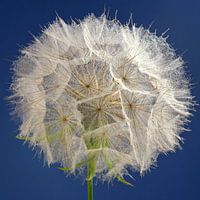Een morgenster (Tragopogon) is familie van de paardenbloem, en als de bloem van deze plant uitgebloeid is, ontstaat er een prachtige pluizenbol, zoals deze. De pluisjes van deze pluizenbol lijken een soort spinnenweb achtige structuur te hebben, waar de kleine waterdruppeltjes mooi in blijven hangen. De achtergrond van dit werk heeft een blauwe kleur. Hierdoor ontstaat een eenvoudig beeld.