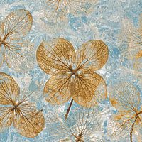 "Een vierkantje met hortensiablaadjes liggend op een grijsblauw bedje" is een macrofoto van een hortensiablaadje, die aan het vergaan is, waardoor de prachtige nervenstructuur mooi te zien is. Aan de buitenzijde van het werk zie je nog meer stukjes van hortensiablaadjes, maar op de hortensia in het midden licht de focus. Dit blaadje heeft mooie warme kleuren in verschillende bruintinten (zoals bijvoorbeeld beige, taupe, licht en donker bruin). Het blaadje ligt op een bed van een water vasthoudende laag waarin een grijsblauwe kleur zichtbaar is. Hierdoor ontstaat een aparte structuur, wat bijna grafisch aanvoelt, maar het is toch echt gefotografeerd.