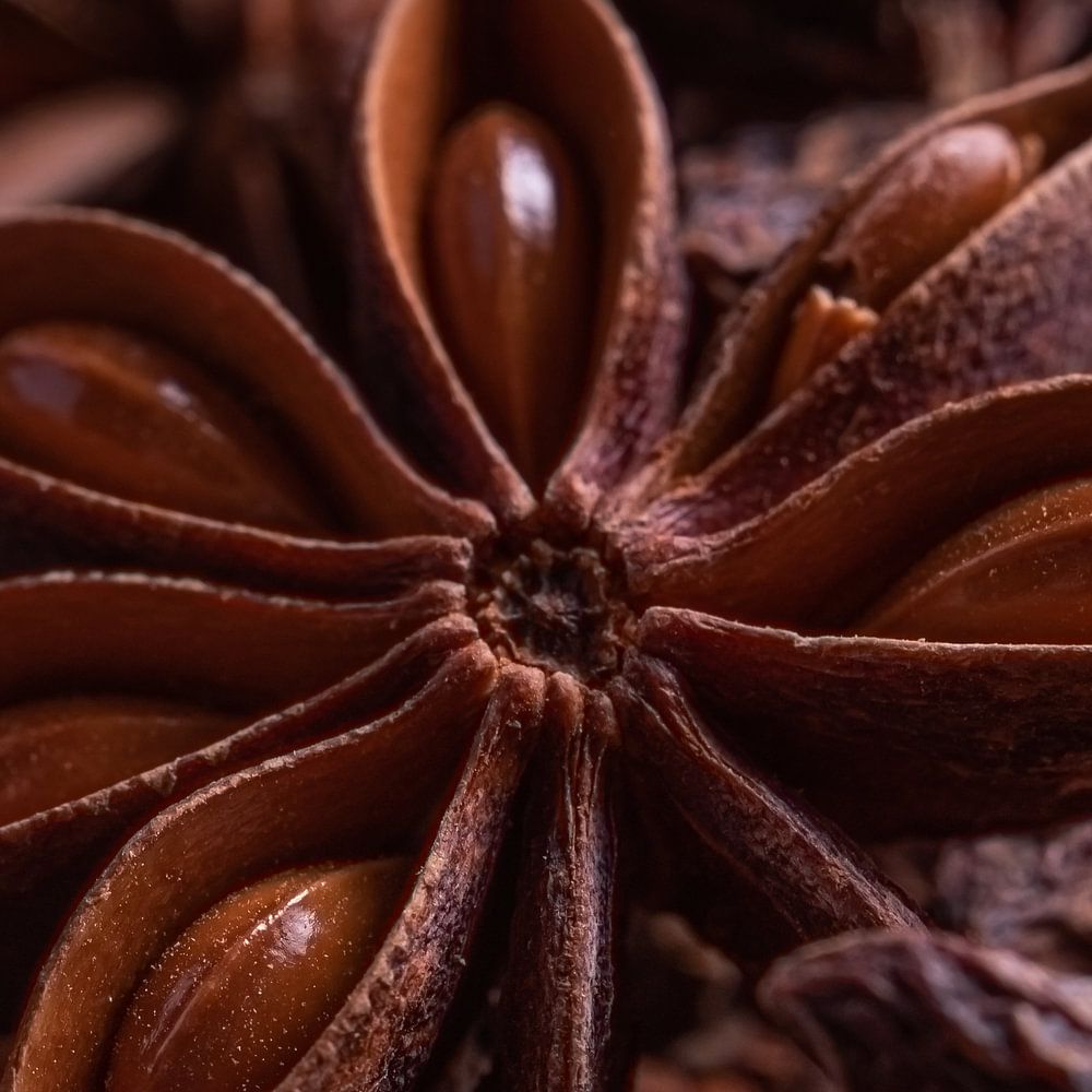 "Een vierkantje steranijs" is een macrofoto van steranijs. De oranje - bruine warme kleuren geven een gezellige warme sfeer.