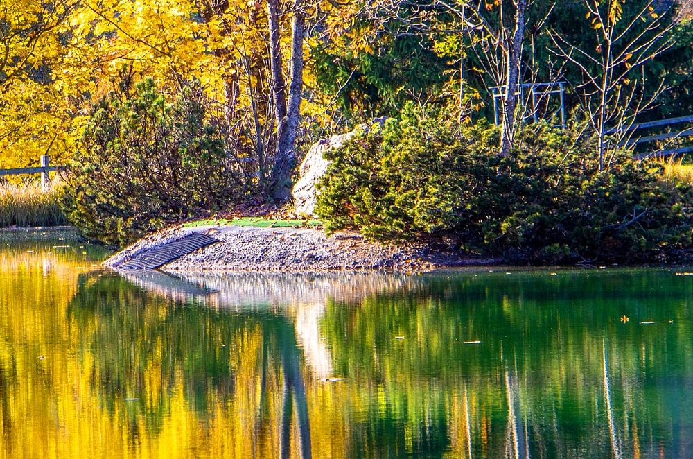 Kleurrijke struiken worden weerspiegeld in de zwemvijver in St. Johann